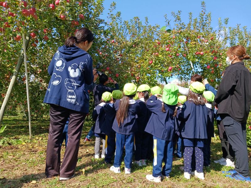 年少リンゴ狩りの様子です。真っ赤に実ったりんごを見つけるたびに、子どもたちの目がキラキラ輝いていました。自分で収穫したりんごを大事そうに抱える姿がとてもかわいらしい一日でした。